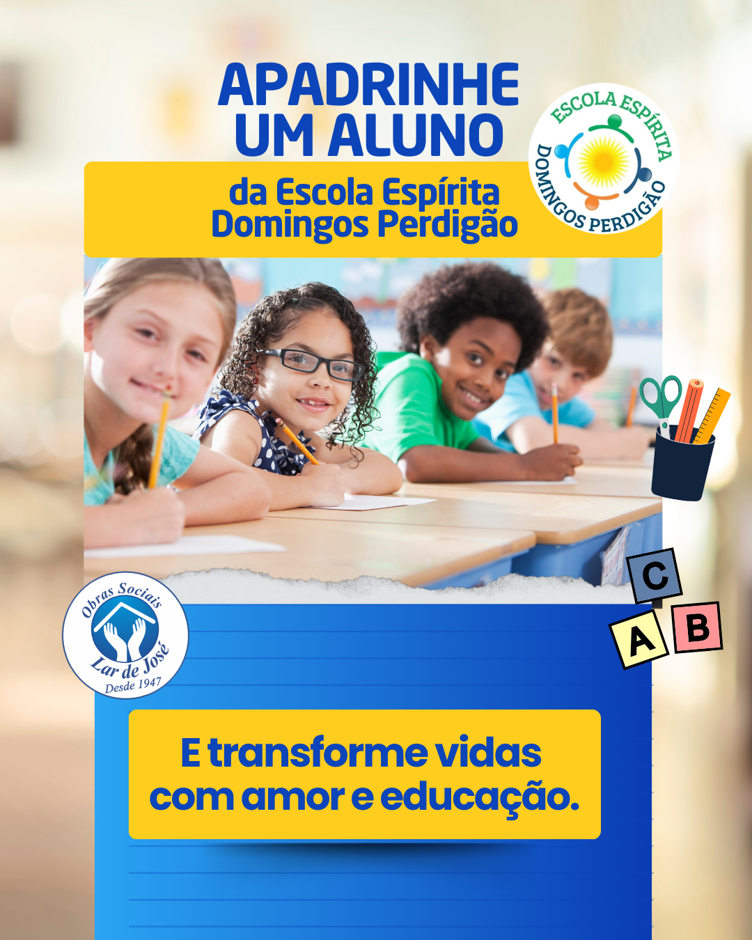 Lançamos oficialmente a Campanha “Apadrinhe um Aluno”, com um convite especial para você fazer parte dessa corrente de amor e educação! 💙✨🎒