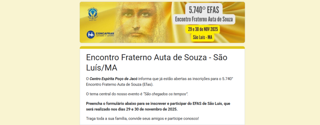 O Encontro Fraterno Auta de Souza (EFAS) é um evento espírita que reúne corações e mentes em torno da Doutrina Espírita, promovendo estudo, fraternidade e serviço no bem.